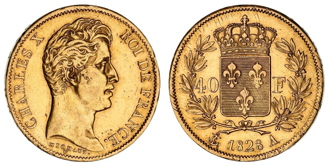 France, Bourbon Restoration, Charles X (1824-1830), Gold 40-Francs, 1828 A, Paris, Type II, bare head right, rev. crowned shield in wreath, edge incuse lettered downwards, 12.81g, 6h (Gad. 1105; KM 721.1; Fb. 547), cleaned and lightly contact marked, adjustment marks to reverse, very fine, one of only 541,840 struck