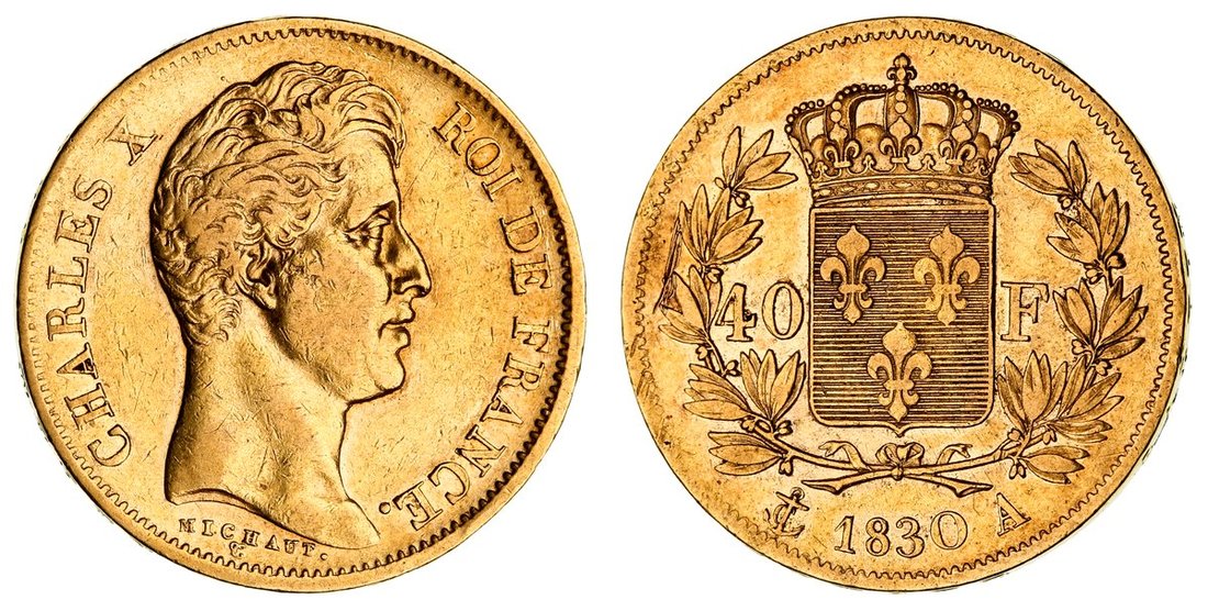 France, Bourbon Restoration, Charles X (1824-1830), Gold 40-Francs, 1830 A, Paris, Type II, bare head right, rev. crowned shield in wreath, raised lettered edge downwards, 12.83g, 6h (Gad. 1105A; KM 721.1; Fb. 547), lightly bagmarked and with softness to the hair, yet lustrous, very fine