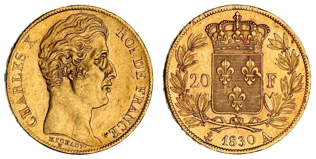 France, Bourbon Restoration, Charles X (1824-1830), Gold 20-Francs, 1830 A, Paris, Type II, bare head right, rev. crowned shield in wreath, with 5 leaves, edge incuse lettered downwards, 6.43g, 6h (Gad. 1024; KM 726.1; Fb. 549), small metal flaw to neck and a scattering of light contact marks, lustrous, good very fine