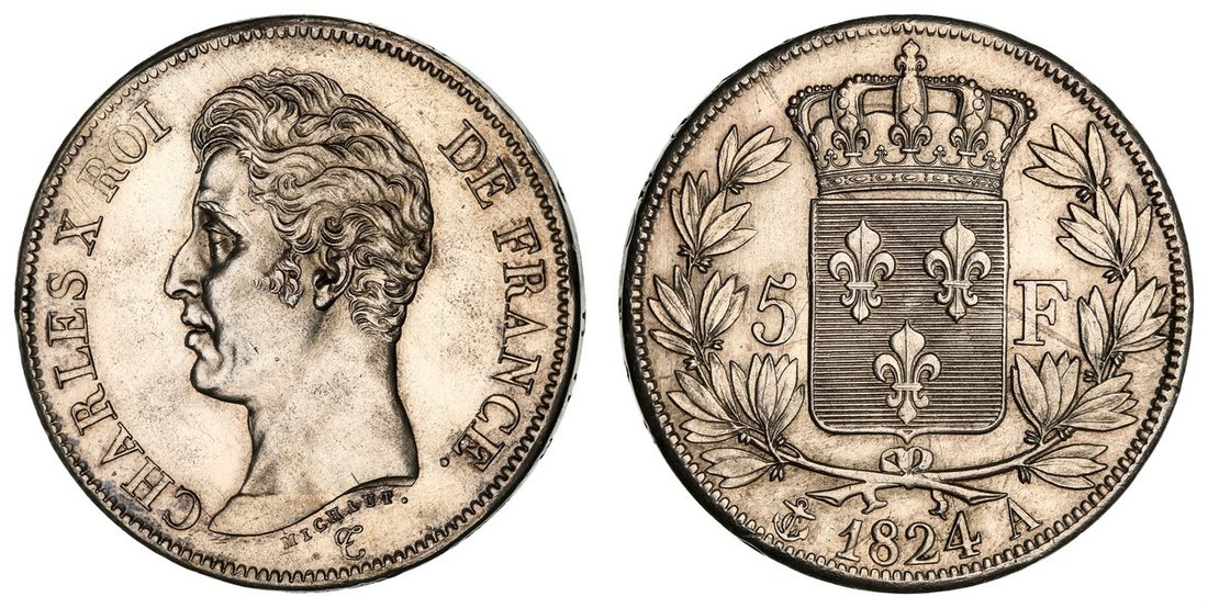 France, Bourbon Restoration, Charles X (1824-1830), 5-Francs, 1824 A, Paris, Type I, bare head left, rev. value in wreath, edge incuse lettered downwards, 25.00g, 6h (Gad. 643; KM 720.1), bright and with brushmarks to surfaces, streak of toning to reverse, nonetheless with a remaining lustre, very fine