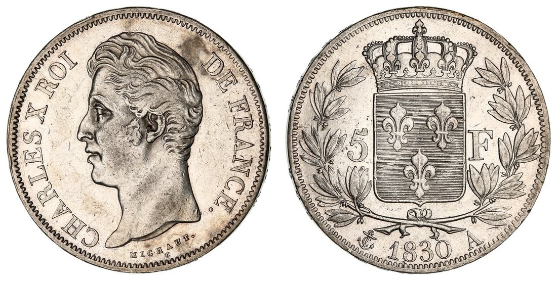 France, Bourbon Restoration, Charles X (1824-1830), 5-Francs, 1830 A, Paris, Type II, bare head left, rev. crowned shield in wreath, edge raised lettered downwards, 25.01g, 6h (Gad. 644a; KM 727.1), bagmarked and smoothed patch behind bust, bright and lustrous fields, about very fine