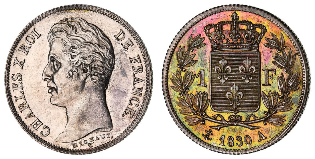 France, Bourbon Restoration, Charles X (1824-1830), 1-Franc, 1830 A, Paris, 4-Leaf Type, bare head left, rev. crowned shield in wreath, edge fluted, 5.03g, 6h (Gad. 450a; KM 724.1), reverse perhaps artificially toned, a rare variety, good very fine