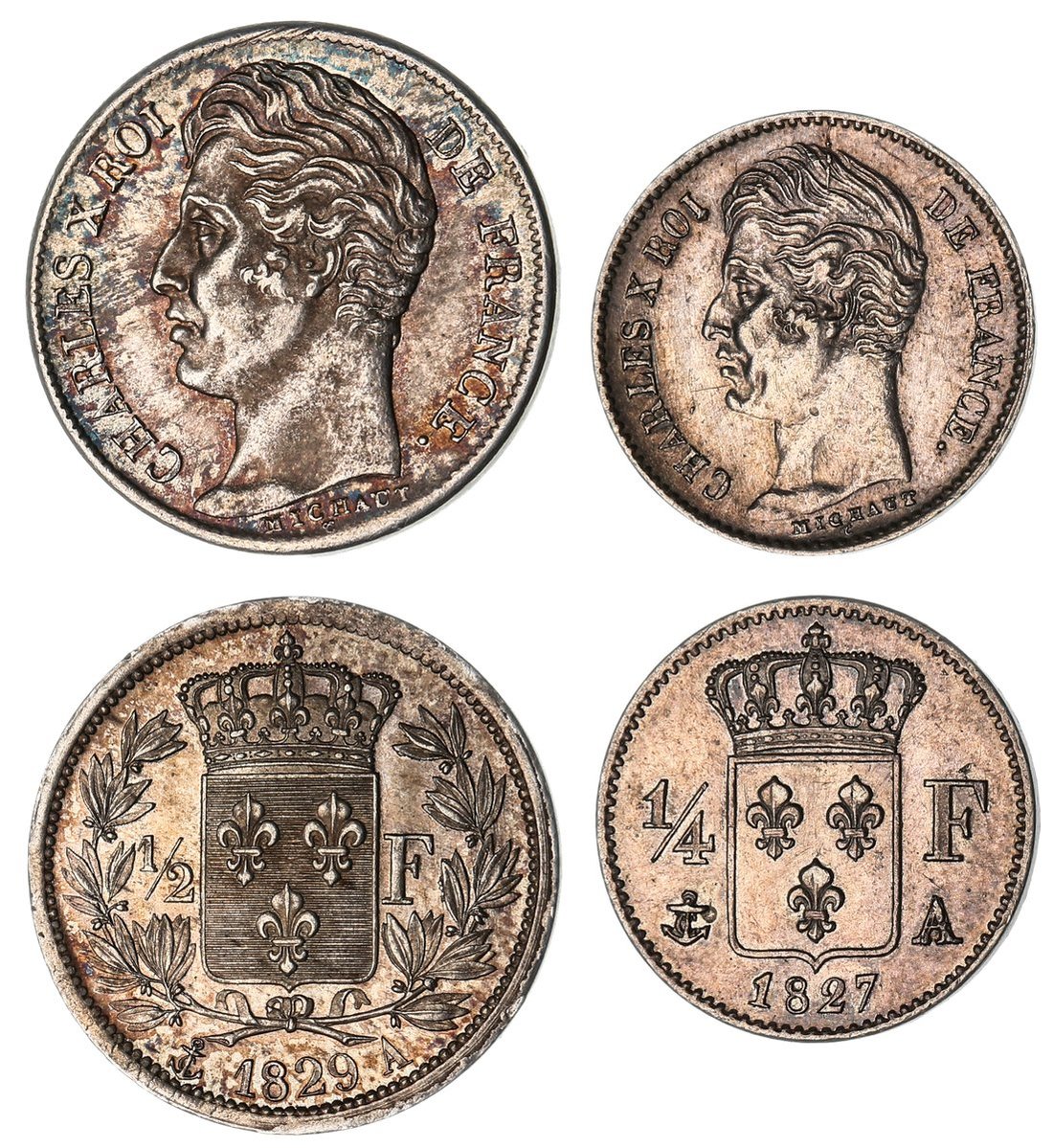 France, Bourbon Restoration, Charles X (1824-1830), Half-Franc, 1829 A, Paris, bare head left, rev. crowned shield within wreath, edge plain, 2.44g, 6h (Gad. 402; KM 723.1), toned and with lustre, extremely fine; Quarter-Franc, 1827 A, Paris, as before, edge plain, 1.26g, 6h (Gad. 353; KM 722.1), some brush marks, very fine (2)