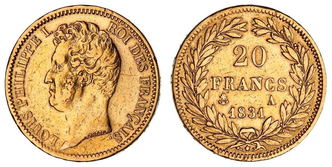 France, Louis-Philippe I (1830-1848), Gold 20-Francs, 1831 A, Paris, bare head left, rev. value in wreath, edge incuse lettered downwards, 6.39g, 6h (Gad. 1030; KM 739; Fb. 553), cleaned, good fine