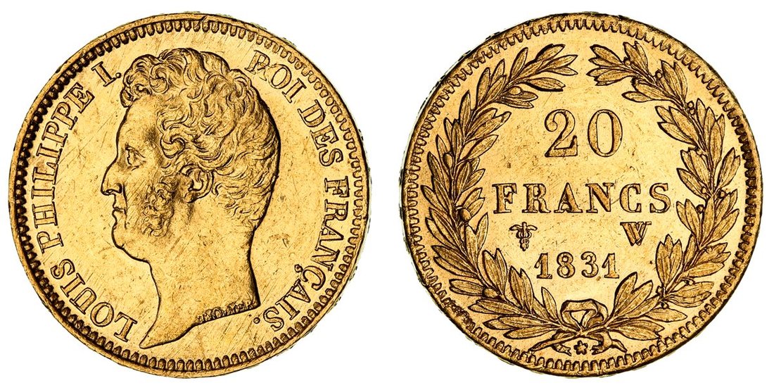 France, Louis-Philippe I (1830-1848), Gold 20-Francs, 1831 W, Lille, bare head left, rev. value in wreath, edge raised lettered downwards, 6.44g, 6h (Gad. 1030a; KM 746.4; Fb. 556), bright and bagmarked, with a residual lustre, strict very fine