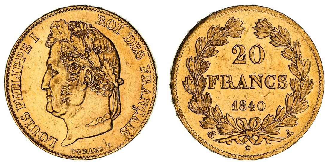 France, Louis-Philippe I (1830-1848), Gold 20-Francs, 1840 A, Paris, laureate bust left, rev. value in wreath, edge raised lettered downwards, 6.42g, 6h (Gad. 1031; KM 750.1; Fb. 560), lightly bagmarked and bright, lustre to peripheries, very fine