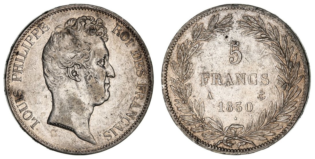 France, Louis-Philippe I (1830-1848), 5-Francs, 1830 A, Paris, bare head right, name on truncation, rev. value in wreath, edge raised lettered downwards, 24.81g, 6h (Gad. 675a; F. 314/1; KM 738), wiped and bagmarked, near very fine, the scarcer 'raised edge' one-year of issue type