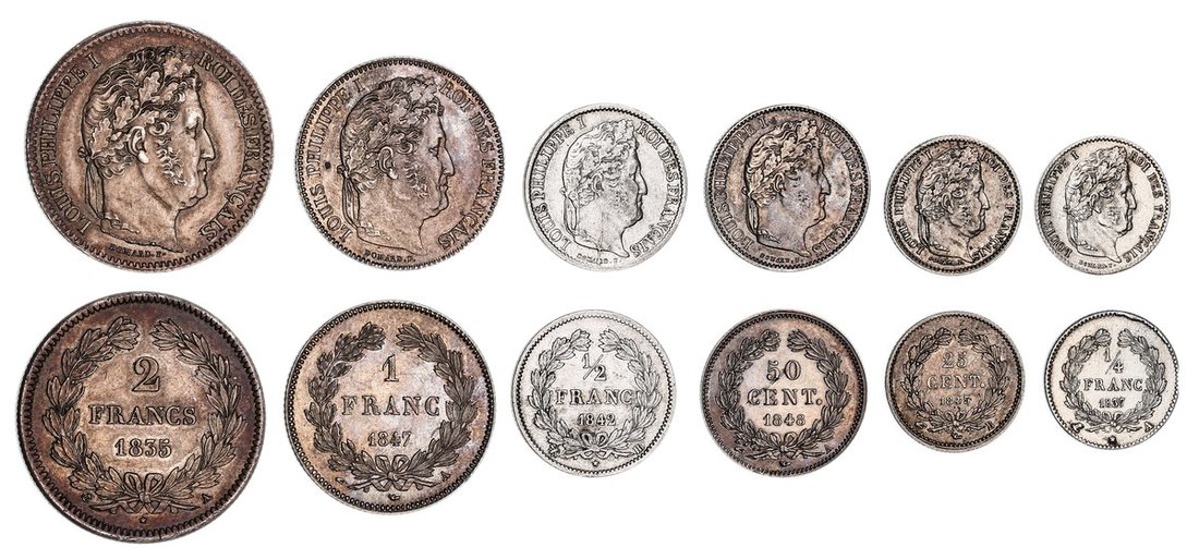 France, Louis-Philippe I (1830-1848), 2-Frans, 1835 A, Paris, laureate bust right, name below truncation, rev. value in wreath, edge milled, 9.96g, 6h (F. 260/42; KM 743.1), wiped and lightly contact marked, otherwise with a lustrous tone, very fine; 1-Franc, 1847 A, Paris, as before, edge milled, 4.98g, 6h (F. 210/110; KM 748.1), couple of contact marks to reverse, lustrous and toned, extremely fine; 50-Centimes, 1848 A, Paris, as before, edge milled, 2.48g, 6h (F. 183/15; KM 768.1), wiped and with a flan flaw to reverse, with a glossy toned lustre, very fine; 25-Centimes, 1845 B, Rouen, as before, edge milled, 1.23g, 6h (F. 167/1; KM 755.2), very fine; Half-Franc, 1842 BB, Strasbourg, as before, edge milled, 2.46g, 6h (F. 182/95; KM 741.3), wiped and with flan flaw to truncation, strict very fine; Quarter-Franc, 1837 A, Paris, as before, edge milled, 1.20g, 6h (F. 166.63; KM 740.1), scratched before portrait, lustrous, very fine (6)