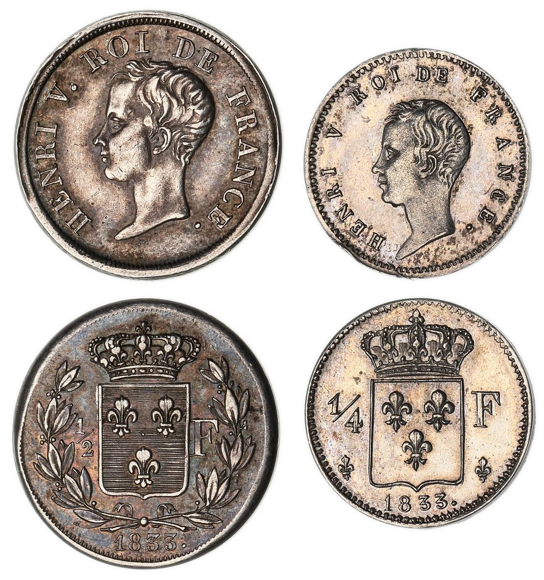 France, Henry V "The Pretender", Count of Chambord and Duke of Bordeaux (1844-1883), Essai Pattern Silver Half-Franc, 1833, young bare head left, rev. crowned shield in wreath, edge plain, 2.60g, 6h (Gad. 404), excess metal to edge, toned, very fine, scarce; Essai Pattern Silver Quarter-Franc, 1833, as before, edge plain, 1.40g, 6h (Gad. 354), lustrous, extremely fine, scarce (2)