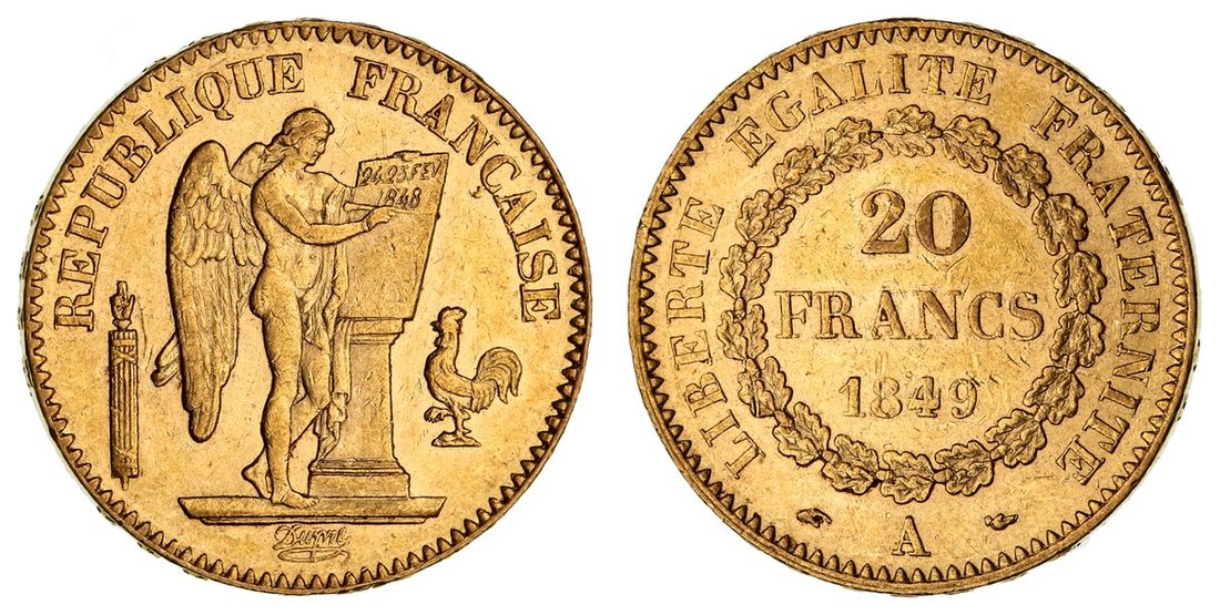 France, Second Republic, Louis-Napoleon Bonaparte (1848-1852), Gold 20-Francs, 1849 A, Paris, Genius standing right, writing the constitution, rev. value in wreath, edge raised lettered downwards, 6.44g, 6h (Gad. 1032; KM 757; Fb. 565), lightly contact marked, nonetheless with a pleasing lustre beneath, very fine, two-year type of issue