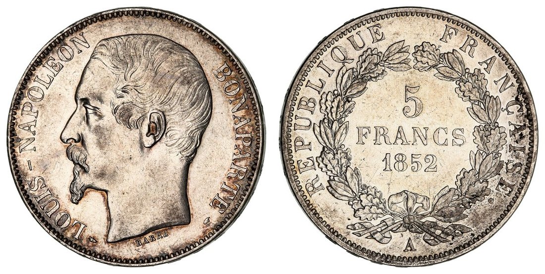 France, Second Republic, Louis-Napoleon Bonaparte (1848-1852), 5-Francs, 1852 A, Paris, Type I, bare head left, rev. value in wreath, edge raised lettered downwards, 24.90g, 6h (Gad. 726; F. 329.1; KM 773.1), lightly contact marked, yet with a pleasing residual lustre and toning to peripheries, nearing extremely fine