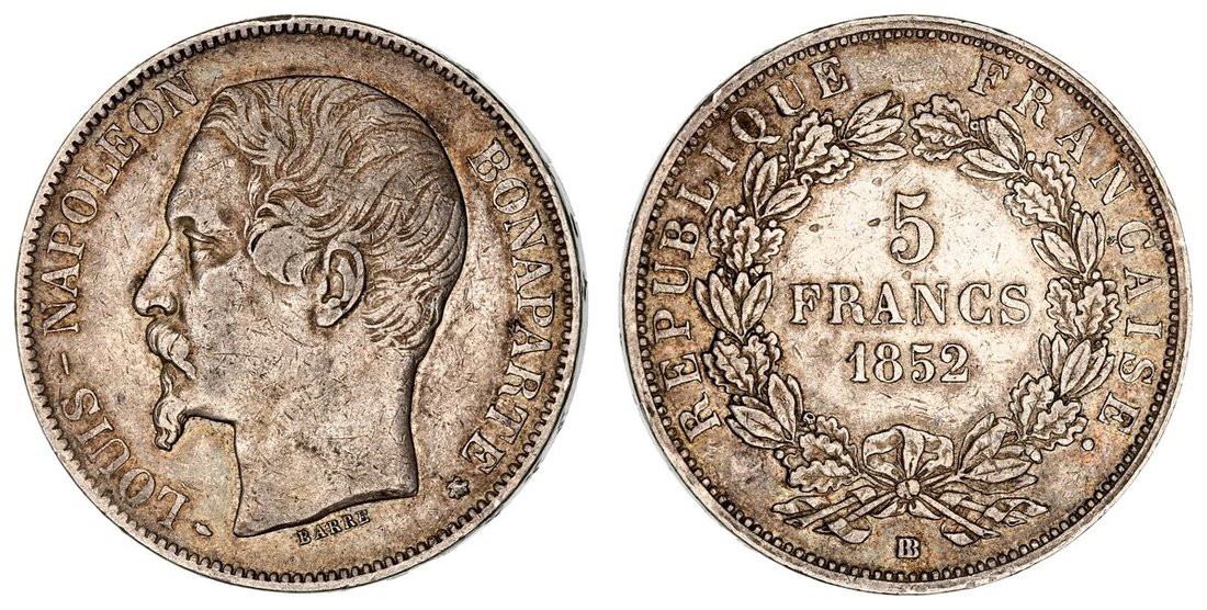 France, Second Republic, Louis-Napoleon Bonaparte (1848-1852), 5-Francs, 1852 BB, Strasbourg, Type I, bare head left, rev. value in wreath, edge raised lettered downwards, 24.88g, 6h (Gad. 726; F. 329/3; KM 773.2), bagmarked and rubbed, lightly toned, good fine, scarce