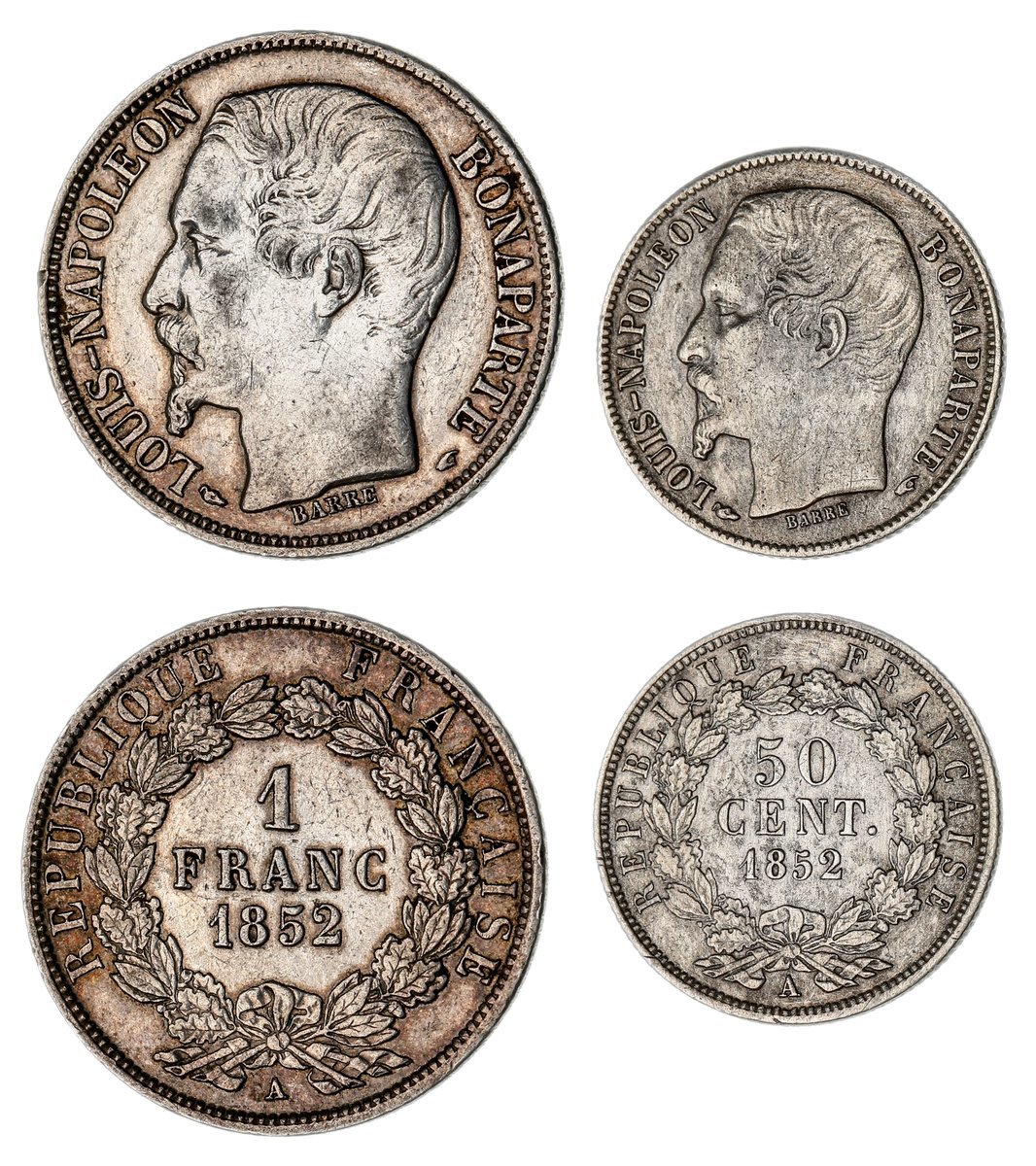 France, Second Republic, Louis-Napoleon Bonaparte (1848-1852), 1-Franc, 1852 A, Paris, bare head left, rev. value in wreath, edge milled, 4.98g, 6h (KM 772; F.212/1), wiped and lightly contact marked, very fine; 50-Centimes, 1852 A, as before, edge milled, 2.44g, 6h (KM 793; F.185.1), cleaned, very fine, one-year type (2)