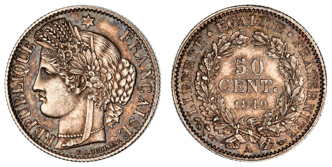 France, Second Republic, Louis-Napoleon Bonaparte (1848-1852), 50-Centimes, 1849 A, Paris, bust of Ceres left, rev. value in wreath, edge milled, 2.50g, 6h (Gad. 411; F. 184.1; KM 769.1), toned with lustre, extremely fine, one of only 2,655 struck and thus rare