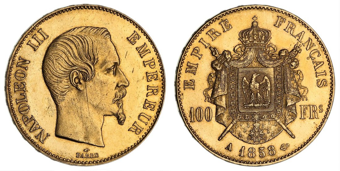 France, Second Empire, Napoleon III (1852-1870), Gold 100-Francs, 1858 A, Paris, bare head right, rev. crowned shield on mantle, edge raised lettered downwards, 32.22g, 6h (Gad. 1135; KM 786.1; Fb. 569), hairlined and lightly contact marked, otherwise with a flashy and proof-like brilliance, about extremely fine