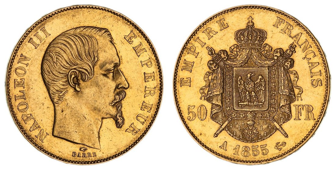 France, Second Empire, Napoleon III (1852-1870), Gold 50-Francs, 1855 A, Paris, bare head right, rev. crowned shield on mantle, edge raised lettered downwards, 16.13g, 6h (Gad. 1111; KM 785.1; Fb. 571), lightly contact marked, otherwise with a pleasing and flashy near brilliance, nearing extremely fine
