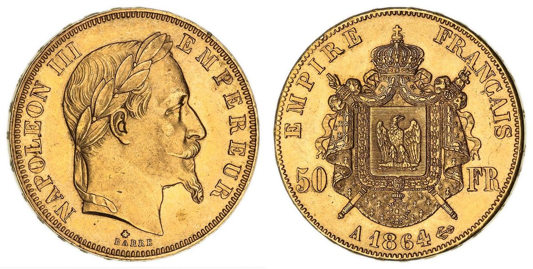 France, Second Empire, Napoleon III (1852-1870), Gold 50-Francs, 1864 A, Paris, laureate head right, rev. crowned shield on mantle, edge raised lettered downwards, 16.09g, 6h (Gad. 1112; KM 804.1; Fb. 582), light contact marks, otherwise with a cartwheel lustre, about extremely fine
