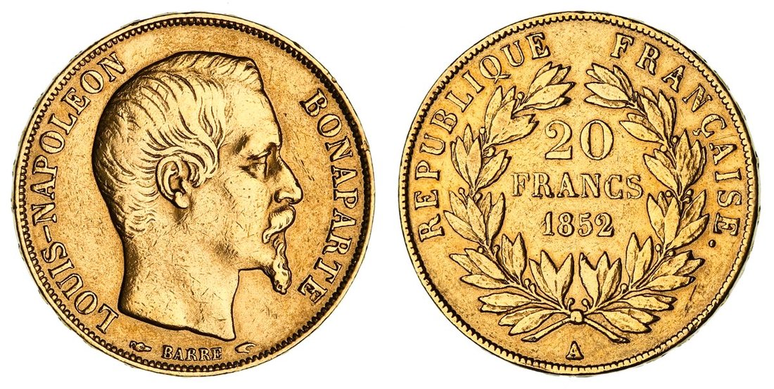 France, Second Empire, Napoleon III (1852-1870), Gold 20-Francs, 1852 A, Paris, bare head right, rev. value in wreath, edge raised lettered downwards, 6.38g, 6h (Gad. 1060; KM 774; Fb. 568), heavily cleaned, bolder fine, one-year of issue type