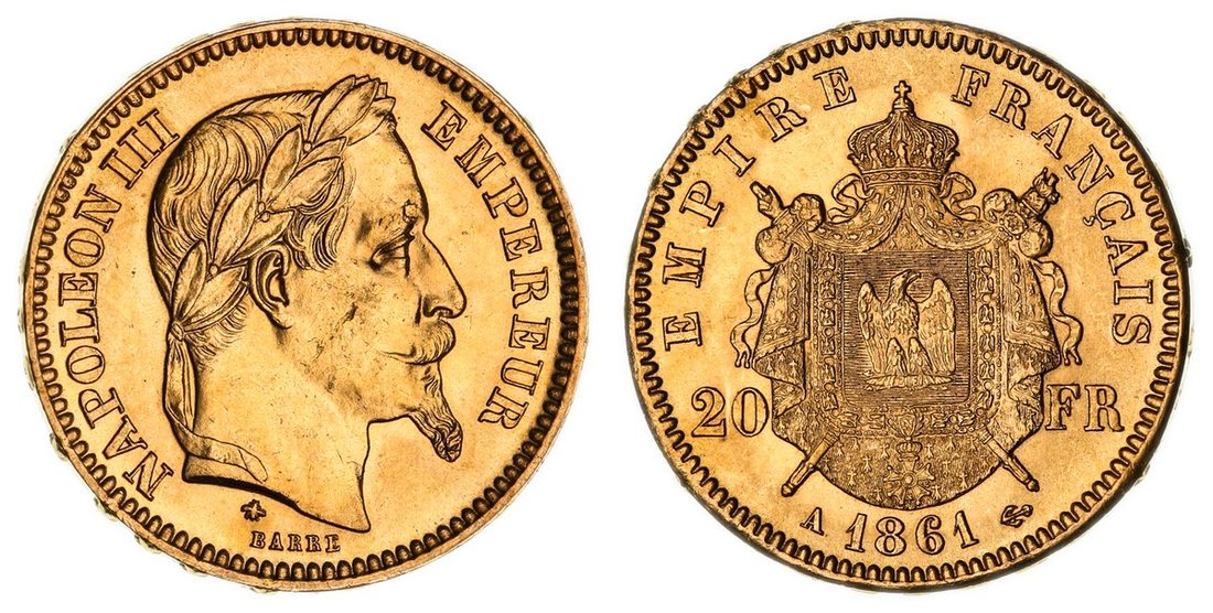 France, Second Empire, Napoleon III (1852-1870), Gold 20-Francs, 1861 A, Paris, laureate head right, rev. crowned shield on mantle, edge raised lettered downwards, 6.45g, 6h (Gad. 1062; KM 801.1; Fb. 584), cheek scuff, lustrous satin fields, extremely fine