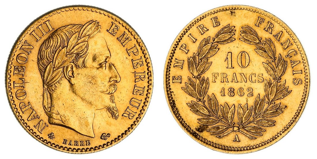 France, Second Empire, Napoleon III (1852-1870), Gold 10-Francs, 1862 A, Paris, laureate head right, rev. value in wreath, edge reeded, 3.23g, 6h (Gad. 1015; KM 803.1; Fb. 586), signs of wear, lustrous, about extremely fine