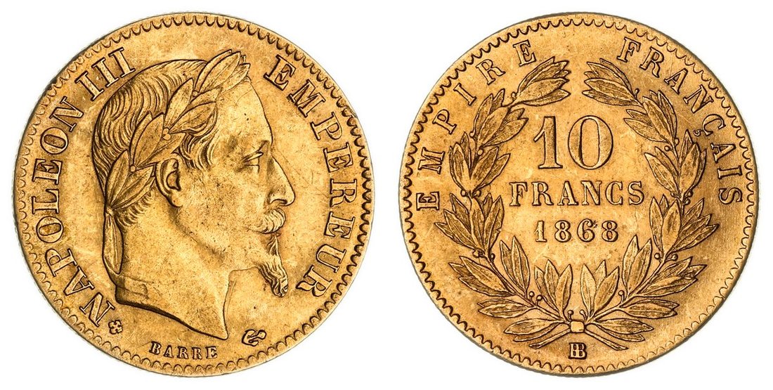 France, Second Empire, Napoleon III (1852-1870), Gold 10-Francs, 1868 BB, Strasbourg, laureate head right, rev. value in wreath, edge reeded, 3.23g, 6h (Gad. 1015; KM 803.2; Fb. 587), most minor of contact marks, lustrous, extremely fine