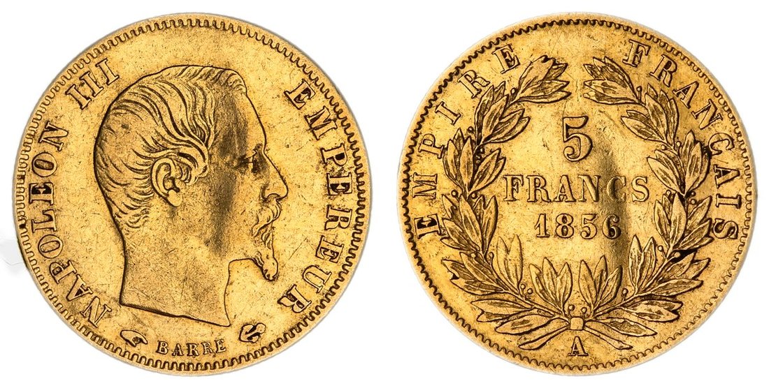 France, Second Empire, Napoleon III (1852-1870), Gold 5-Francs, 1856 A, Paris, 'small' bare head right, rev. value in wreath, edge reeded, 1.61g, 6h (Gad. 1001; KM 787.1; Fb. 578a), rubbed and small dent to flan, very fine