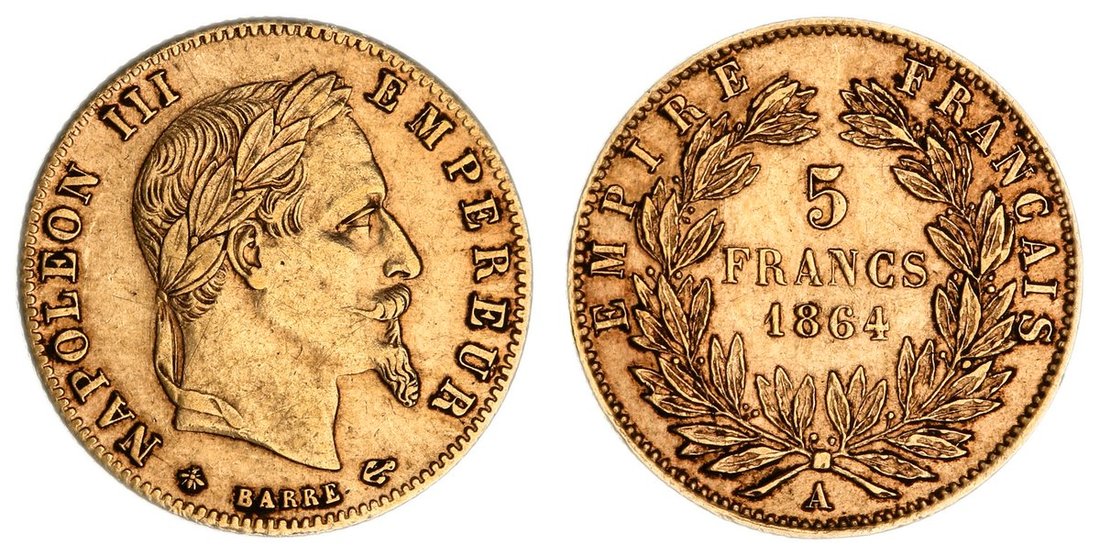 France, Second Empire, Napoleon III (1852-1870), Gold 5-Francs, 1864 A, Paris, laureate head right, rev. value in wreath, edge reeded, 1.61g, 6h (Gad. 1002; KM 803.1; Fb. 588), hairline left of portrait and light signs of wear, deposits to legends, very fine