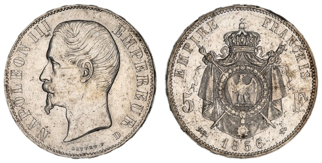 France, Second Empire, Napoleon III (1852-1870), 5-Francs, 1856 D, Lyon, bare head left, rev. crowned shield on mantle, edge raised lettered downwards, 25.10g, 6h (Gad. 734; KM 782.3), bagmarked, otherwise with a remaining mint bloom, nearing extremely fine