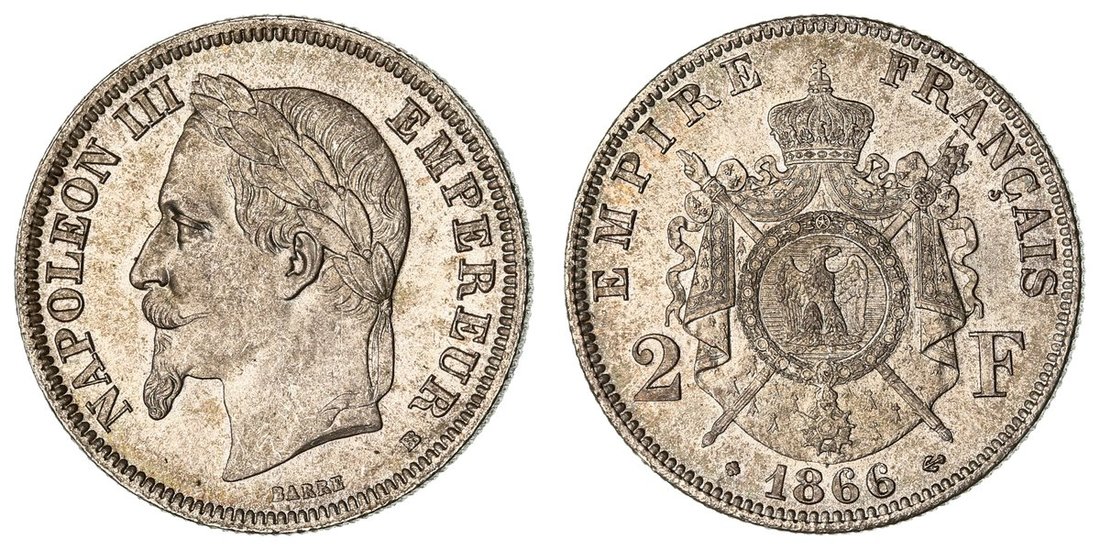 France, Second Empire, Napoleon III (1852-1870), 2-Francs, 1866 BB, Strasbourg, laureate head left, rev. crowned shield on mantle, edge milled, 10.03g, 6h (Gad. 527; KM 807.2), couple of mere surface marks otherwise with a full mint bloom, choice uncirculated