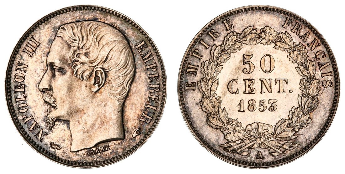 France, Second Empire, Napoleon III (1852-1870), 'Large Head' 50-Centimes, 1853 A, Paris, large bare head left, rev. value in wreath, edge plain, 2.49g, 6h (F. 186/1), with dark patching toning to otherwise flashy and lustrous fields, extremely fine, one-year of issue type