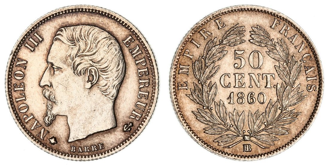France, Second Empire, Napoleon III (1852-1870), 50-Centimes, 1860 BB, Strasbourg, 'New Bee' Type, bare head left, rev. value in wreath, edge milled, 2.49g, 6h (Gad. 414; KM 794.1; F. 187/12), obverse wiped and with resulting hairline scratches to fields, otherwise with a remaining lustre and toned, very fine, reverse better