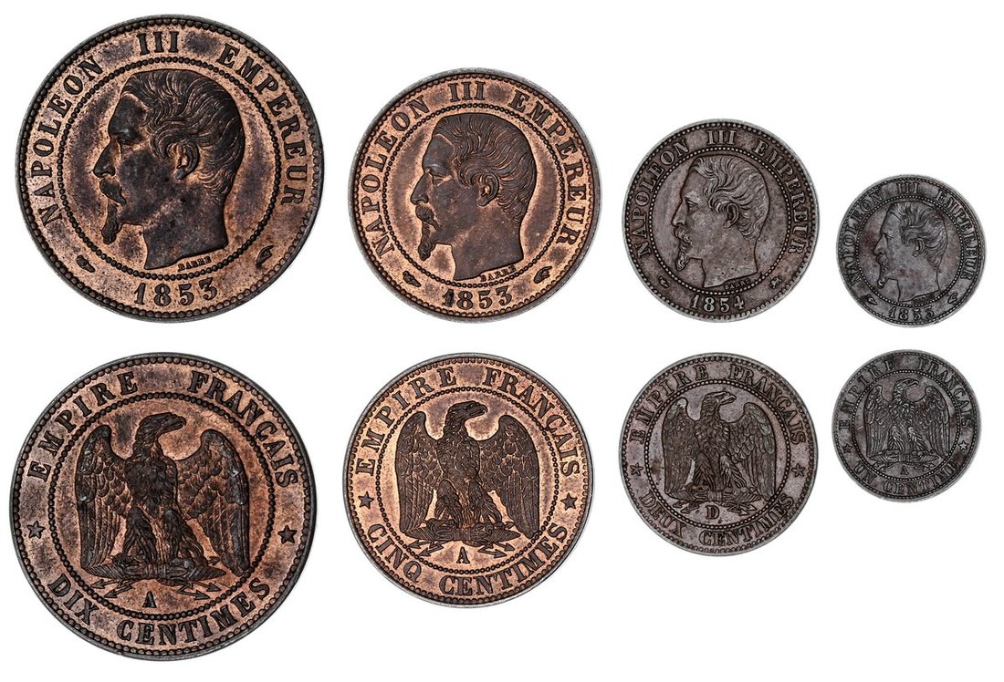 France, Second Empire, Napoleon III (1852-1870), 10-Centimes, 1853 A, Paris, edge plain, 9.90g, 6h (KM 771.1), extremely fine; 5-Centimes, 1853 A, Paris, edge plain, 5.06g, 6h (KM 771.1), good extremely fine; 2-Centimes, 1854 D, Rouen, edge plain, 2.01g, 6h (KM 776.4), very fine; 1-Centime, 1853 A, Paris, edge plain, 0.99g, 6h (KM 775.1), very fine (4)