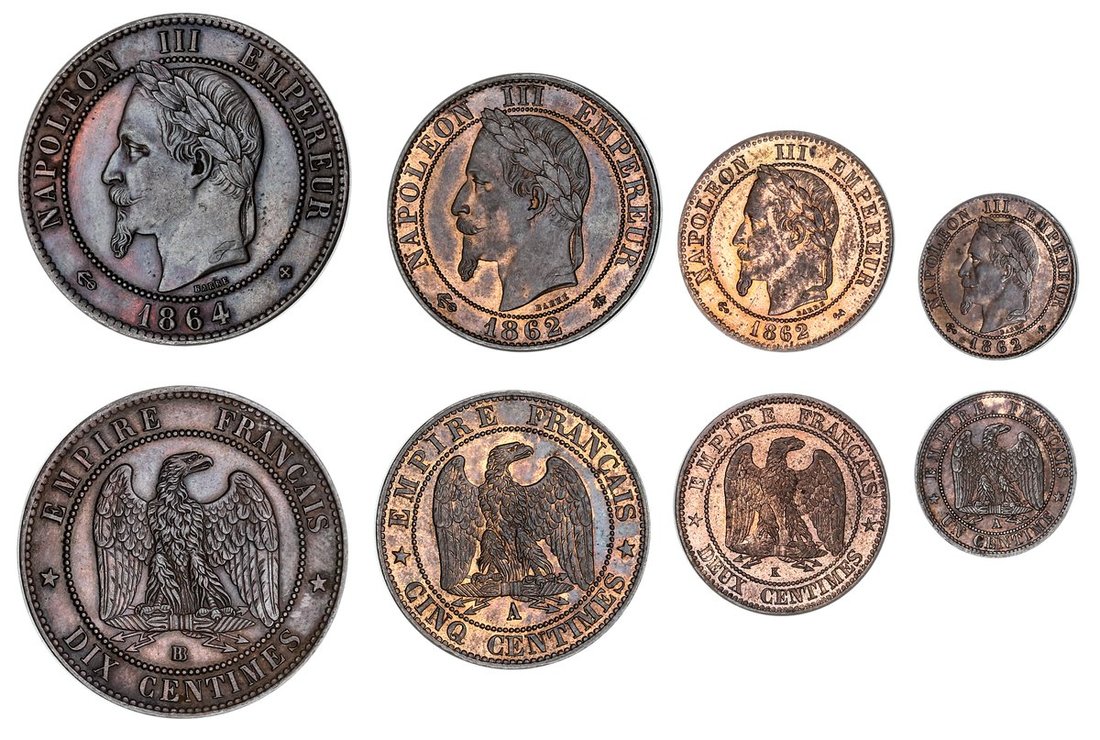 France, Second Empire, Napoleon III (1852-1870), 10-Centimes, 1864 BB, Strasbourg, laureate head left, rev. eagle, edge plain, 9.94g, 6h (Gad. 253; KM 798.2), toned, about very fine; 5-Centimes, 1862 A, Paris, as before, edge plain, 5.17g, 6h (Gad. 155; KM 797.1), extremely fine; 2-Centimes, 1862 K, Bordeaux, as before, edge plain, 1.96g, 6h (Gad. 104; KM 796.6), about uncirculated; 1-Centimes, 1862 A, Paris, as before, edge plain, 0.98g, 6h (Gad. 87; KM 795.1), good very fine (4)