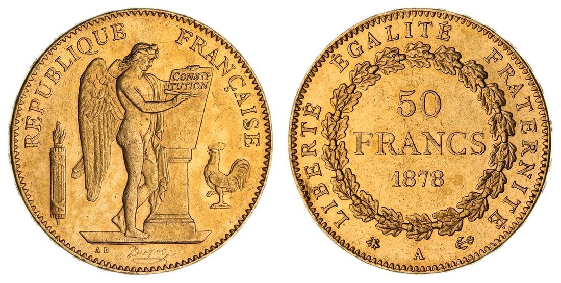 France, Third Republic (1870-1940), Gold 50-Francs, 1878 A, Paris, angel standing right inscribing legal tablet upon alter, fasces to left and rooster to right, rev. value in wreath, edge raised lettered downwards, 16.08g, 6h (Gad. 1113; KM 831; Fb. 591), light scattering of bagmarks, otherwise lustrous, good very fine