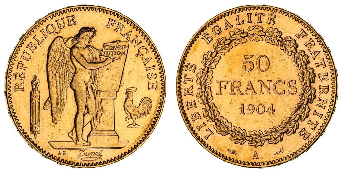 France, Third Republic (1870-1940), Gold 50-Francs, 1904 A, Paris, angel standing right inscribing legal tablet upon alter, fasces to left and rooster to right, rev. value in wreath, edge raised lettered downwards, 16.11g, 6h (Gad. 1113; KM 831; Fb. 591), bright and lightly bagmarked, with a faint edge bruise, yet residually lustrous, very fine