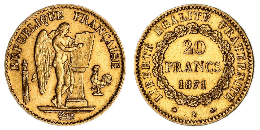 France, Third Republic (1870-1940), Gold 20-Francs, 1871 A, Paris, angel standing right inscribing legal tablet upon alter, fasces to left and rooster to right, rev. value in wreath, edge raised lettered downwards, 6.45g, 6h (Gad. 1063; KM 825; Fb. 592), lightly contact marked, with residual lustre, very fine