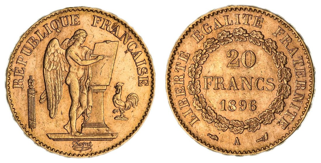 France, Third Republic (1870-1940), Gold 20-Francs, 1896 A, Paris, angel standing right inscribing legal tablet upon alter, fasces to left and rooster to right, rev. value in wreath, edge raised lettered downwards, 6.44g, 6h (Gad. 1063; KM 825; Fb. 592), lightly bagmarked, with a flashy lustre and hint of red tone, about extremely fine