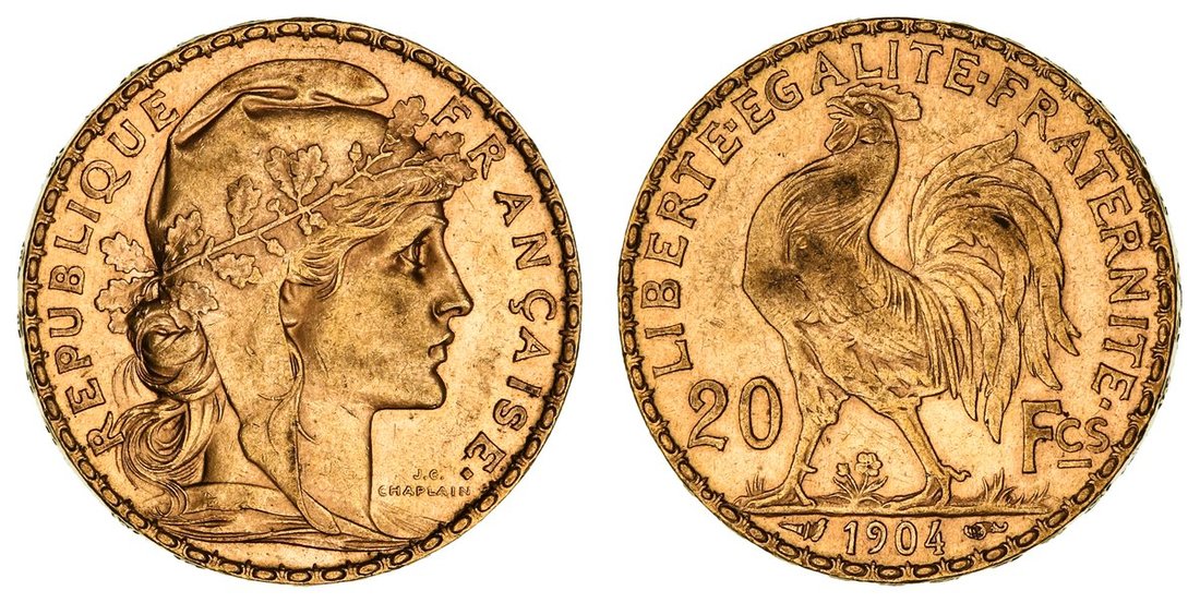 France, Third Republic (1870-1940), Gold 20-Francs, 1904, Paris, bust of Marianne right, rev. cockerel strutting left, edge raised lettered downwards, 6.45g, 6h (Gad. 1064a; KM 847; Fb. 596), touch of rub to reverse and lightly bagmarked, lustrous, about extremely fine