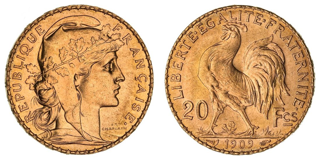 France, Third Republic (1870-1940), Gold 20-Francs, 1909, Paris, bust of Marianne right, rev. cockerel strutting left, edge raised lettered downwards, 6.45g, 6h (Gad. 1064a; KM 847; Fb. 596), light pinmarks to portrait, with a full and pleasing lustre, extremely fine