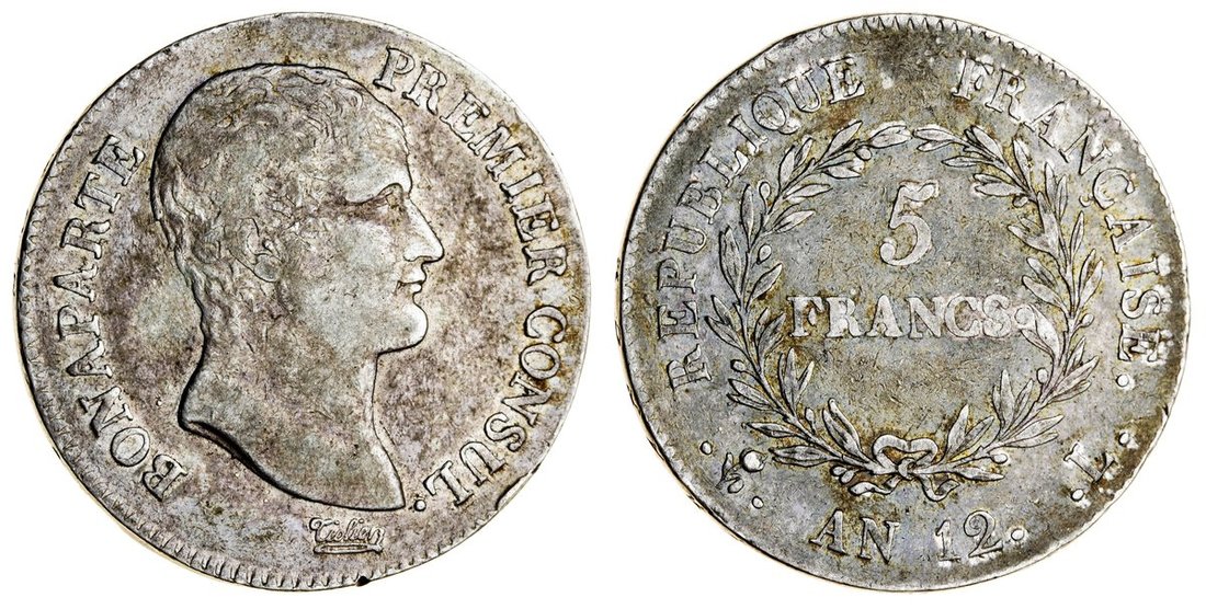 France, First Republic, Consulship, Napoleon Bonaparte (1799-1804), 5-Francs, AN 12 L (1803-04), Bayonne (tulip) (Le Franc 301; Gad 577), toned with some underlying lustre, good fine