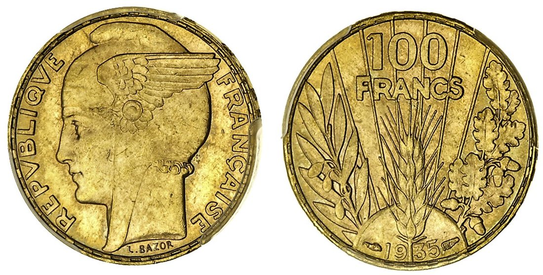 PCGS MS64 | France, Third Republic (1870-1940), Commemorative Gold 100-Francs, 1935, by Bazor, winged head left, in Art Deco style, rev. ear of corn between laurel and oak branch, value above (Le Franc 554.7; Fb 598; Gad 1148; Maz 2345; KM 880), practically mint state, very rare, in PCGS holder graded MS64 (Cert. #17397009)
