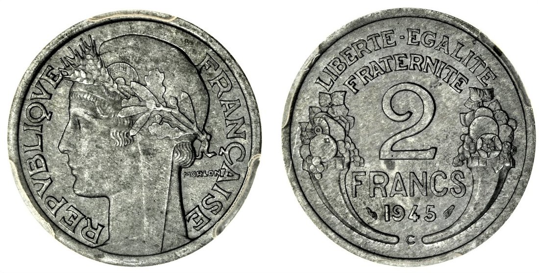 PCGS MS63 | France, Wartime Provisional Government (1944-1946), 2-Francs, 1945 C, Castelsarrasin (Le Franc 269.7; Gad 538), much as struck, scarce thus, in early PCGS holder, graded MS63 (Cert. #17287501)