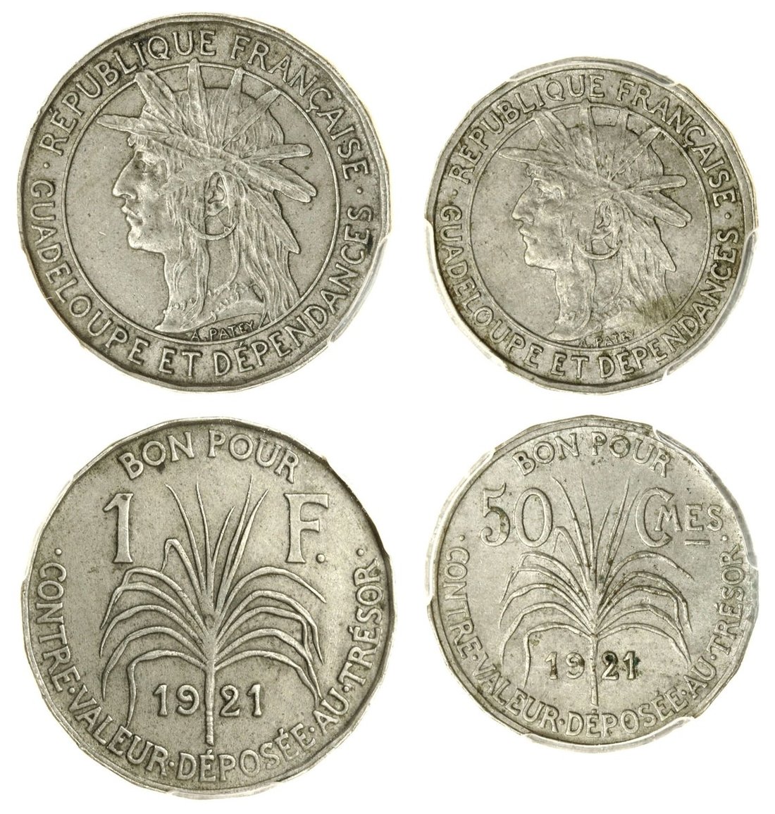 PCGS AU55-AU58 | Guadeloupe, French Protectorate, (Bon Pour) (2), Franc and 50-Centimes, 1921 (Lecompte 50, 58; KM 45-46), in PCGS holders, graded AU55 and AU58 (Cert. #36122527) and (Cert. # 36122534) (2)