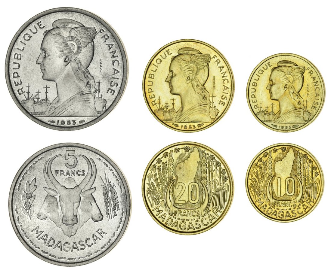 Madagascar, French Protectorate, Pattern 3-Coin Set, 1953 (3), 20; 10 and 5 Francs, marked ESSAI in field (Lecompte 104, 107, 110), brilliant uncirculated, very rare, only 104 sets struck, in fitted holder of issue (3)
