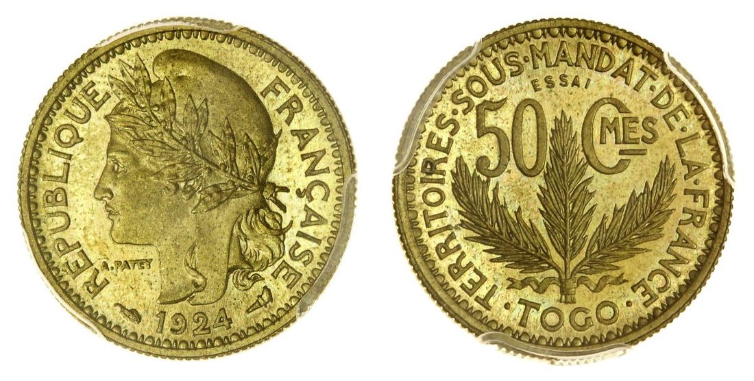 PCGS SP66 | Togo, French Territorial Mandate, Pattern 50-Centimes, 1924, rev. ESSAI in field (Lecompte 6; KM E1), brilliant uncirculated, in PCGS holder, graded SP66 (Cert. #36122583)