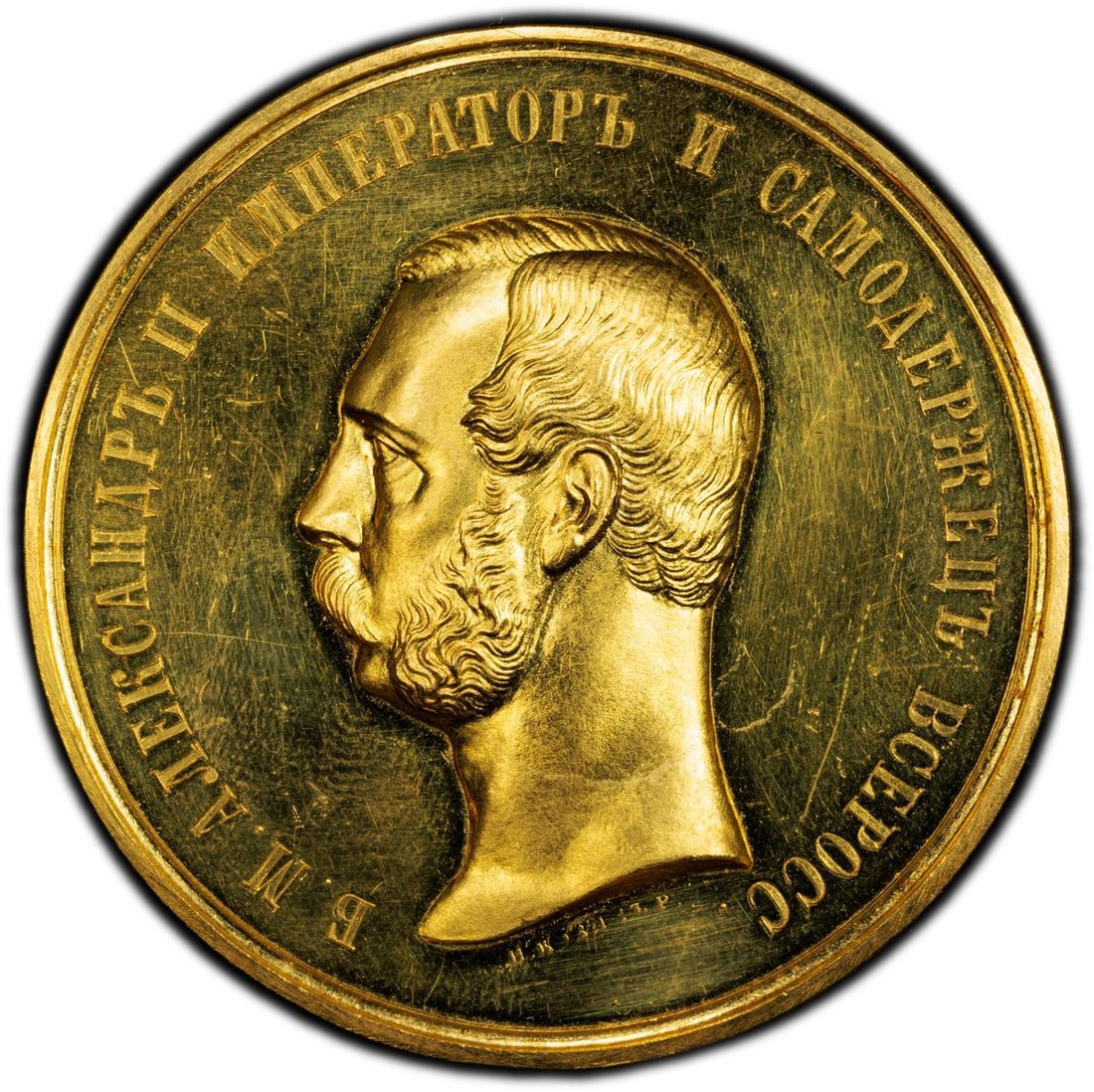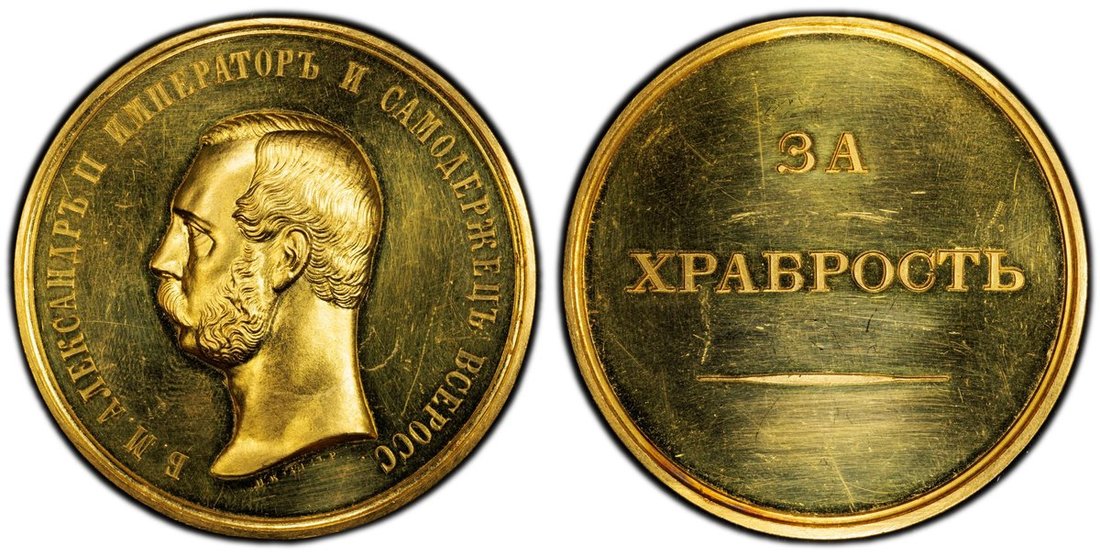 PCGS MS61 | (Tsarist) Russia, Alexander II (1855-1881), Large Gold Medal for Military Bravery [Established 1807], issued for service in the Crimean and Russo-Turkish War [1877/78], by N. Kozin, bare head left, signed below, rev. ?A XPA?POCT?, bar below, 51mm. 69.3g (Diakov 635.2 [R5]; Bitkin 898; Iversen, Medals XVII/I; Sm 562/a), struck without integral loop, with some friction hairlines in field, and a minute test mark on edge, otherwise brilliant, much as struck, and EXCESSIVELY RARE, in PCGS holder, graded MS61 (Cert. #58749927)