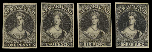 New Zealand 1855 London Print 1d. 2d. 6d. and 1/- plate proofs in black, large margins all round; the 2d. with tiny tone spot and the 6d. lightly creased, otherwise fine and scarce Estimate £ 200-250