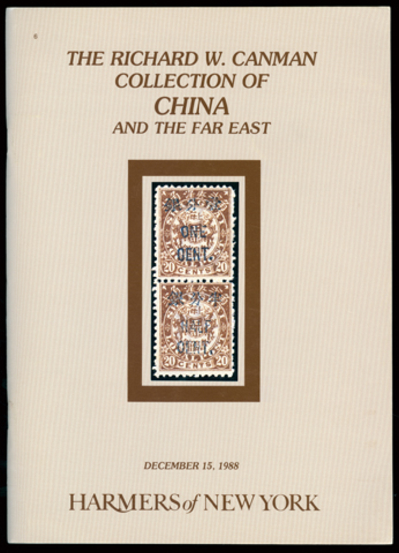 1988 (December 15) The Richard Canman Collection of China and the Far East, Harmers (New York), with prices realised, an important sale for postal history with fine sections of Municipal Posts, Foreign Post Offices, Korea and Express stamps.