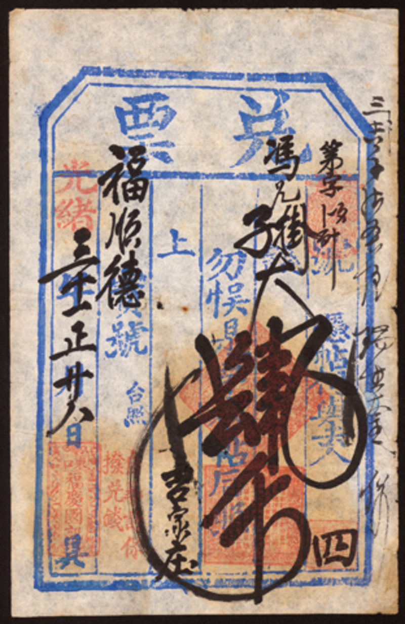 1905 (1st moon, 28th Day) Private Issue 4000 Cash, blue and black with seals in red.