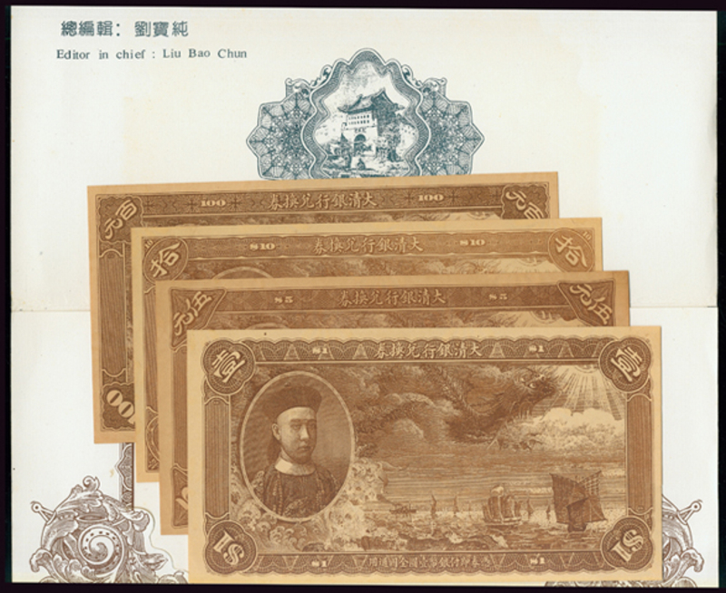 1910 Ta Ching Government Bank Currency Certificates, published by People's Sports Publishing House of China, group of 4 denominations, printed in brown, housed in presentation folder.